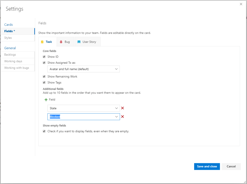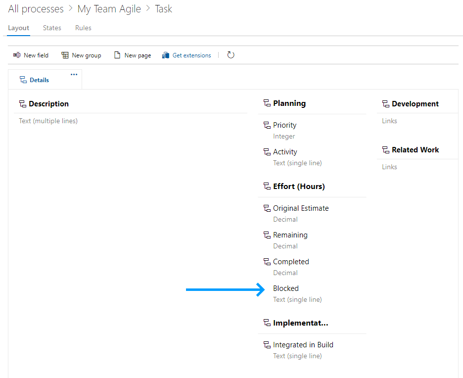2. In the Task section, under the Fields tab, click on the “+ Field” button under Additional fields. Our new Blocked field should now be available in the drop-down menu for fields to display. Ensure this is added here. Repeat the process on the Bug tab if you have also added the Blocked field to the Bug work item type.