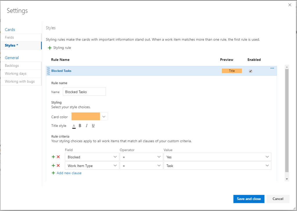 3. Move next to the Styles tab. Add a new styling rule. I named my rule Blocked Tasks, and added the rule criteria as follows: Blocked (Field) = Yes, Work Item Type = Task. Then added a card color of orange.