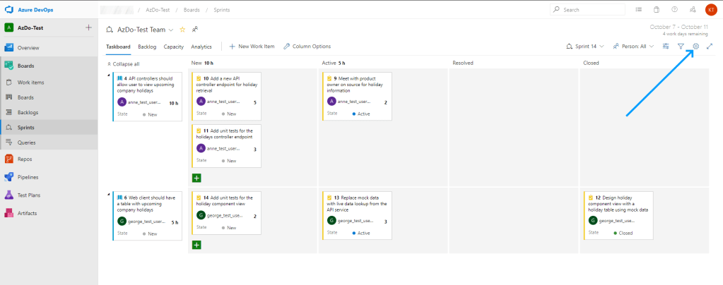 1. Click on the gear icon in the top right of your sprint board to view the sprint board settings.