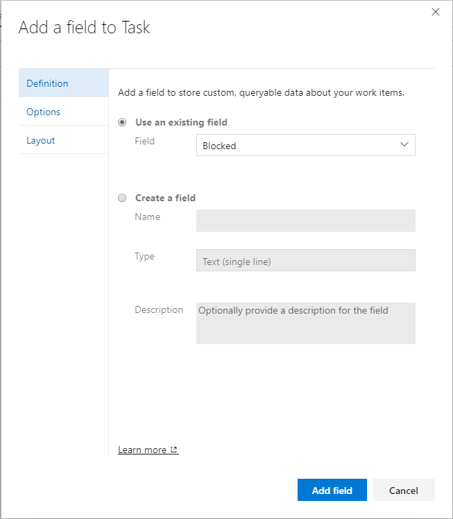 5. On the Definition tab of the Add a field to Task pop-up, select the Use an existing field drop-down and pick the Blocked field. We don’t have to make a new blocked field because Azure DevOps already supports it. Also under the Options tab, select a default value of No.