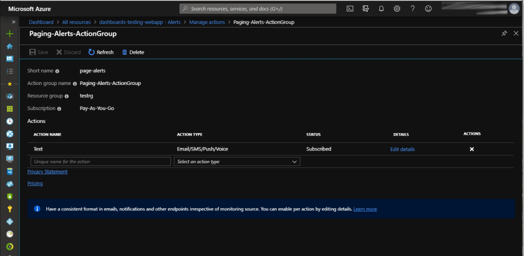 Before we can create alerts we need to define some Azure action groups. An action group defines the set of actions that can be invoked when an alert is triggered. For example: sending a text message, starting an Azure function, or invoking a web hook.