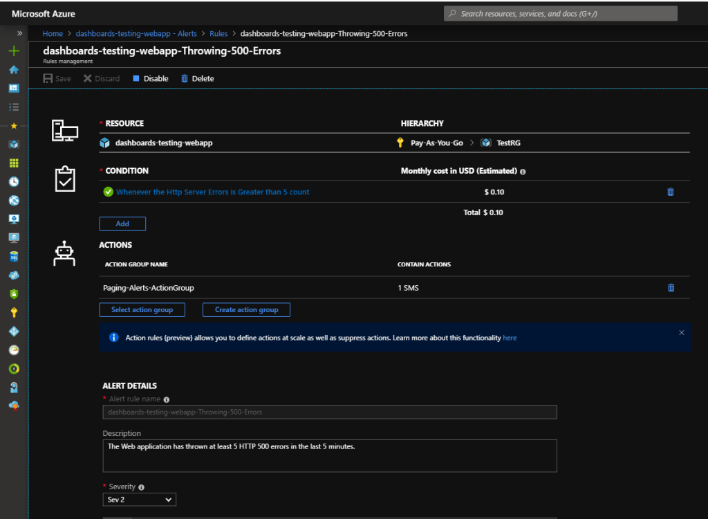 If you use an incident management system, then this is where you would connect/send alerts. For demo purposes I’m just going to have Azure send me text message alerts directly.