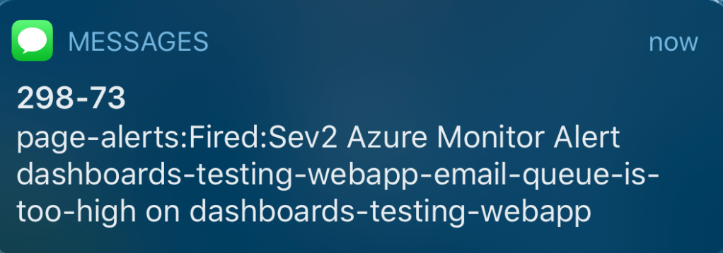The text message alert follows the format below, so keep this in mind when naming the alerts and action groups:
