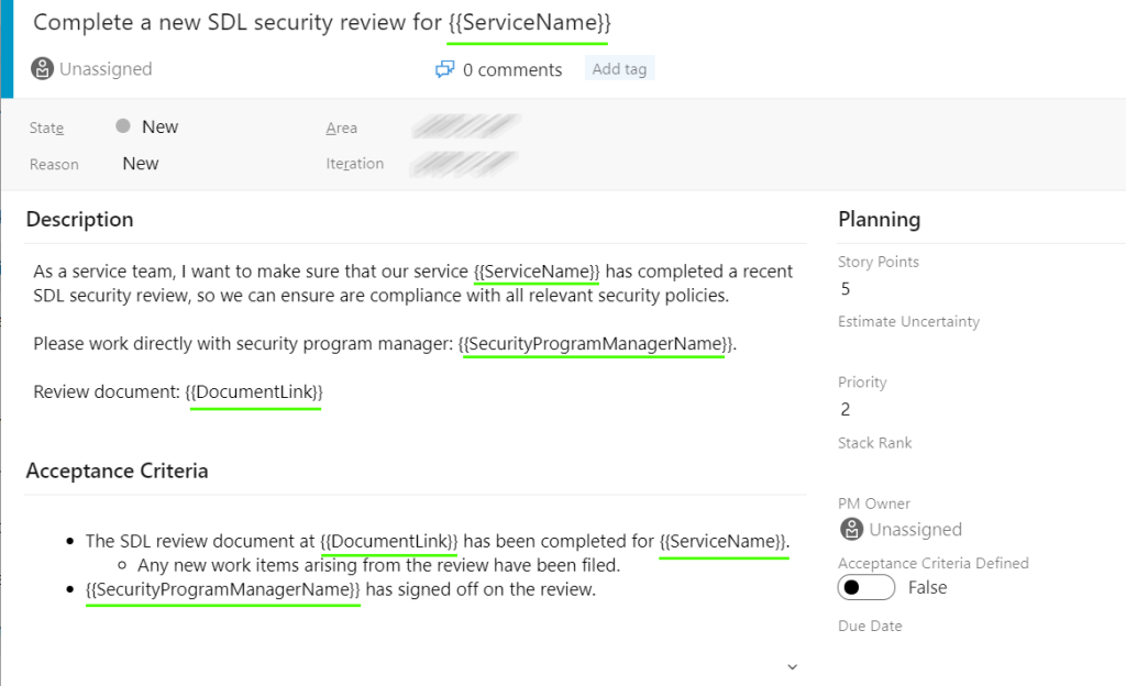 Inline variables are an optional part of the clone script– but they are a powerful way to provide customization for each cloned work item. This clone script supports variables wrapped with double-curly braces. Variable names should be word characters only (no spaces, special characters, etc).